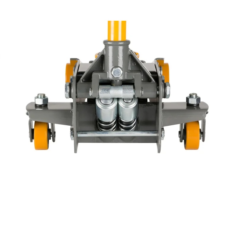 - Колёса домкрата изготовлены из металла с полиуретановым покрытием, что сокращает шум при его перемещении и его стоимость.