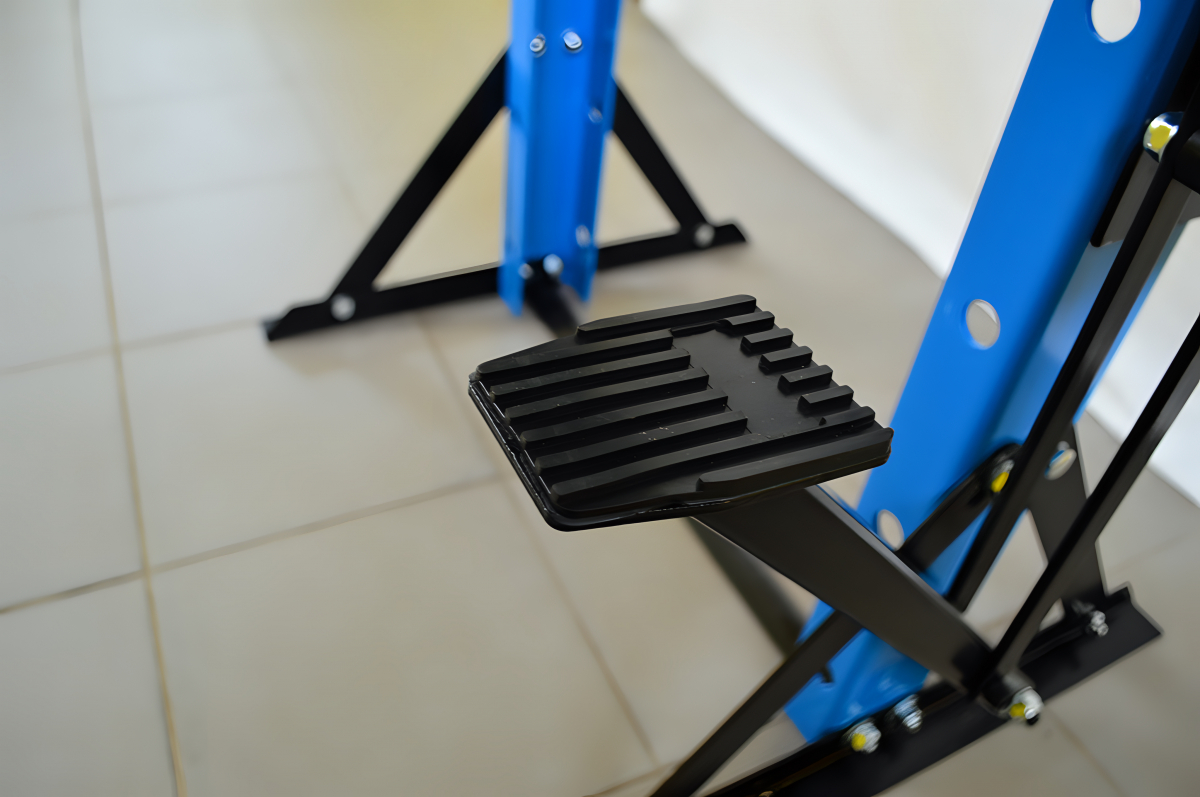 Максимальное усилие составляет 20тонн, ход штока 146мм, регулировка нижнего упора 0-101см. Оборудован как ручным, так и ножным приводом насоса для более удобного использования. Манометр для контроля усилия.
