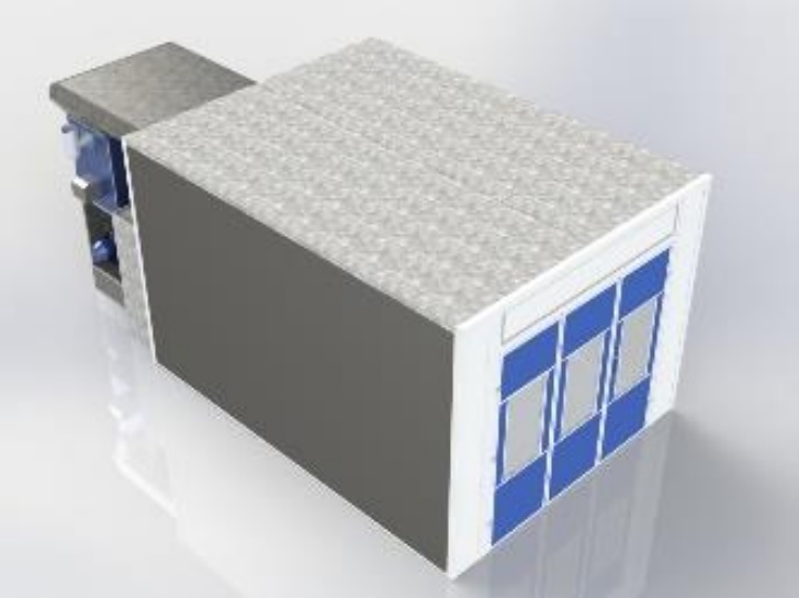 Покрасочная камера тупикового исполнения с роллетными воротами, комплектуются одним или двумя вентиляционными агрегатами повышенной мощности, с номинальной производительностью 30 тыс. куб. метров в час каждый.