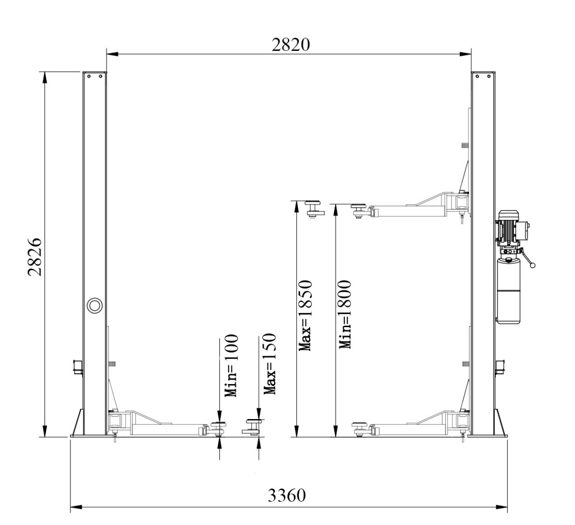 Грузоподъемность этого подъемника составляет 4000 кг. За подъем автомобиля отвечают два гидравлических цилиндра с цепным приводом каретки. Такой тип привода уменьшает нагрузку на гидроцилиндры и обеспечивает долговечность их работы. Каретки снабжены нейлоновыми ползунами, обеспечивающими плавное перемещение внутри стоек. Простая и, в тоже время, надежная система механических стопоров со снятием с двух сторон обеспечивает безопасное удержание автомобиля в поднятом состоянии на протяжении всего времени ремонта. Габаритная высота подъемника составляет 2826 мм и позволяет устанавливать его в помещениях с высотой потолка от 3 метров и выше.
