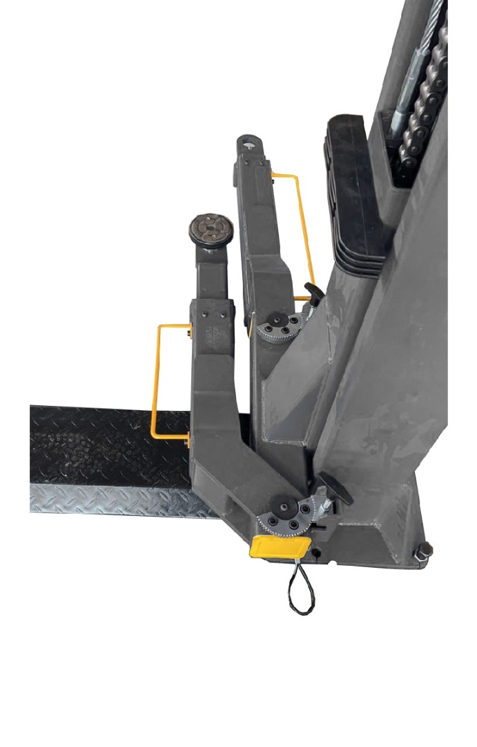 Двухстоечный электрогидравлический подъемник с нижней синхронизацией KRAFTWELL KRW4SLM оснащается каретками с лапами, расположенными снаружи, а не внутри каретки. Зубчатые сегменты, предотвращающие поворот лап в поднятом состоянии, так же находятся снаружи. Короткие лапы имеют длину 740-1050 мм, длинные 890-1390 мм. Все лапы у данного подъемника двухсекционные. Короткие лапы имеют изогнутый профиль, вследствие чего складываются в одну строну с длинными, а не в разные стороны, как у других подъемников.