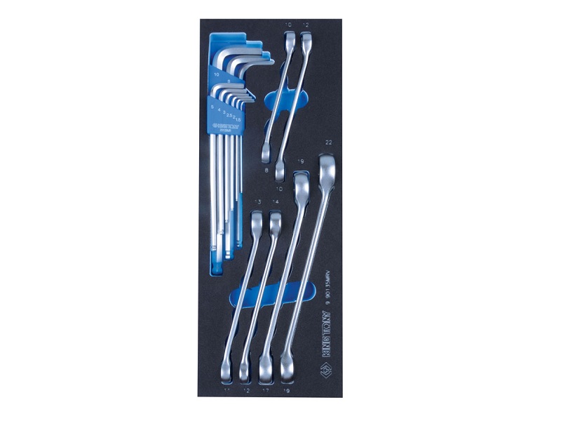 Набор торговой марки KING TONY включает в себя шестигранники для работы с внутренним профилем, а также ключи разрезные, предназначен для монтажа и демонтажа крепёжных узлов различных изделий, устройств и агрегатов. Входящие в состав разрезные ключи предназначены для работ с гайками, расположенными на трубках, длинных шпильках и т.п. Материал ложемента – EVA (ЭВА, этиленвинилацетат). При своей лёгкости, этот материал обладает высокими прочностными характеристиками, стойкостью к маслам и растворителям, при деформации возвращает прежнюю форму. Изготовлен специально для комплектации инструментальной тележки.