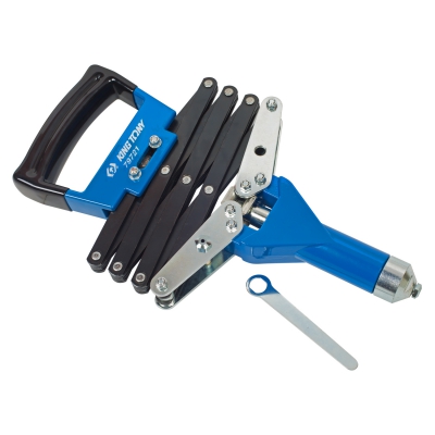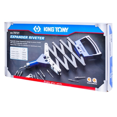 Заклёпочник 3,2-6,4 мм, "гармошка" KING TONY 79721. Заклёпочник предназначен для соединения листового металла, деталей конструкций, а также для выполнения монтажных работ различного характера. В качестве соединительных элементов применяются специальные заклёпки вытяжного типа.