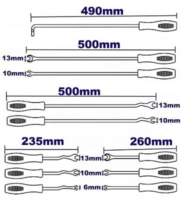 Набор включает в себя съемники различной конфигурации и длины что позволяет перекрыть практически все потребности арматурщика.