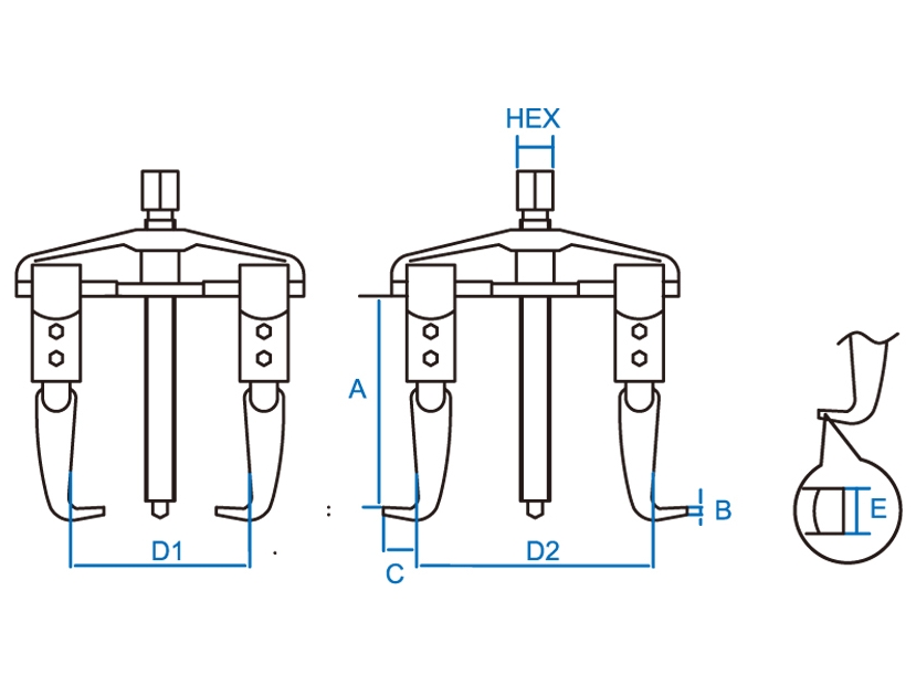 | Съемник подшипников 2-х захватный | 7962B-35 | внешний захват, макс. – 90 мм (D1) внутренний захват, диапазон – 60-125 мм (D2) длина лап – 100 мм (A) ширина лапы – 21 мм (E) толщина лапы – 3,8 мм (B) вынос лапы – 14,5 мм (C) |