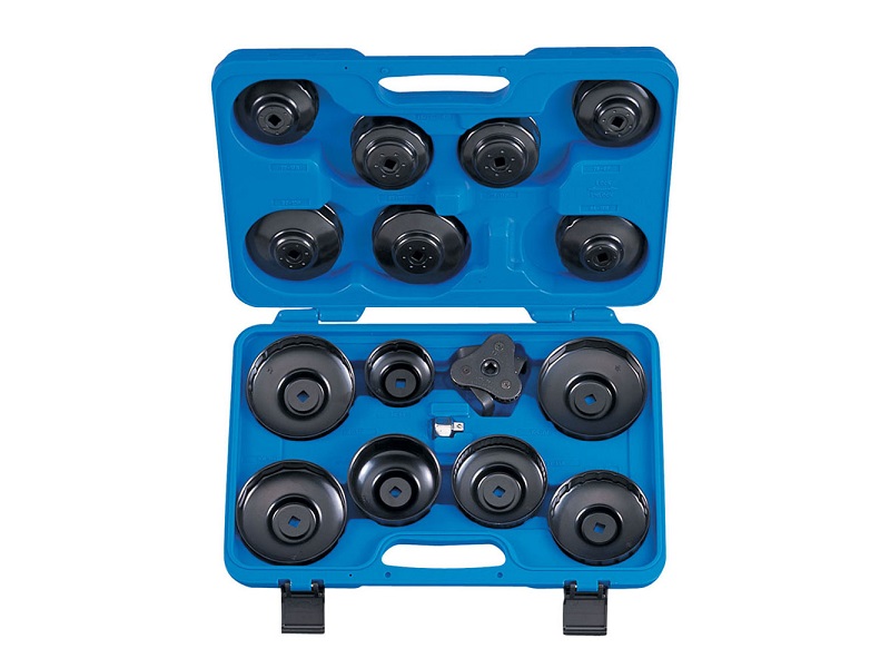 Набор съёмников предназначен для демонтирования масляных фильтров и состоит из 16-ти предметов. В набор входят 14 торцевых съёмников масляных фильтров - "чашки" от 66 до 108 мм, один съёмник трёхлапый от 65 до 120 мм и переходник с 1/2" на 3/8" для подсоединения воротка или трещотки того или другого формата. Защитное оксидированное покрытие защищает инструменты набора от коррозии.