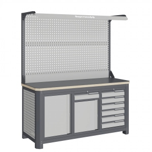 Экран (перфорированная панель) верстака выполнен с квадратной перфорацией 12х12 мм с шагом 38 мм для установки крючков, держателей и других аксессуаров. Экран крепятся к столешнице с помощью специальных кронштейнов. Максимальная масса груза, равномерно распределенного по поверхности экрана, составляет 71 кг.