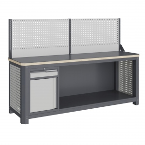 Экран (перфорированная панель) верстака выполнен с квадратной перфорацией 12х12 мм с шагом 38 мм для установки крючков, держателей и других аксессуаров. Экран крепятся к столешнице с помощью специальных кронштейнов. Максимальная масса груза, равномерно распределенного по поверхности экрана, составляет 71 кг.